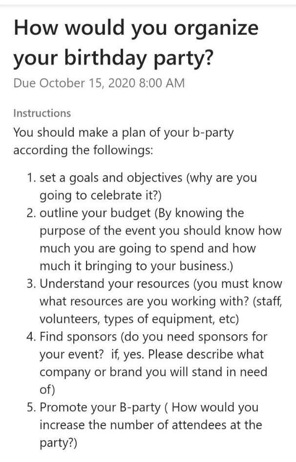 Solved How Would You Organize Your Birthday Party Due Chegg Com